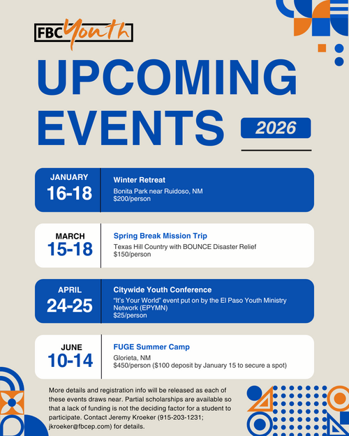 The vision of FBC Youth is to connect students to the love and the life of Jesus so that they can become world-changers for the glory of God. We help students learn the Truth of the Bible, connect with God and others in meaningful ways, and be involved in opportunities to impact the world around them for Christ.